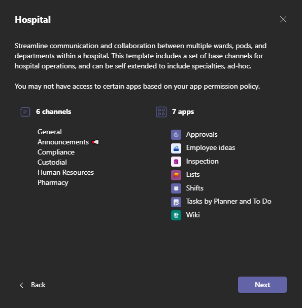 - The team templates come with different channels and built-in apps. If you want to change the template and get one that’s suited to your needs, go back to the previous screen and select a different template.