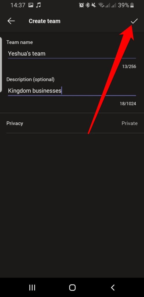 - Tap the **check mark **at the top right corner to create the team.