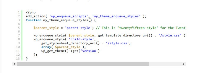 This code adds the stylesheet from the parent directory and then also adds the stylesheet for the child which we created earlier. Note that the parent-style text should match the name of the parent theme with -style added to the end.