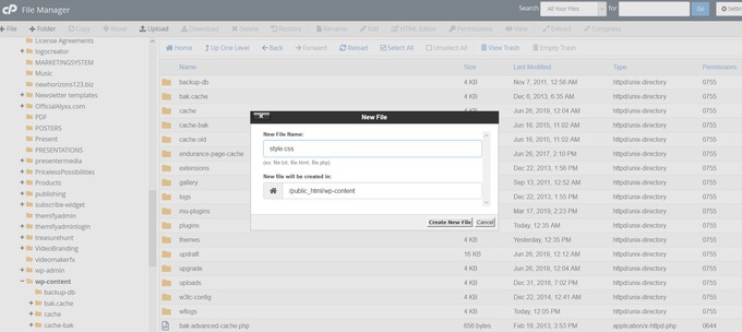 This is usually in a directory named public_html. Locate and open the wp-content folder. Click on create new folder and input a name for your child theme. Be sure to give it a name that you will recognize later. A good example is nameofparenttheme-child.