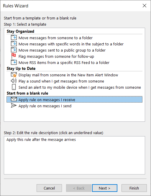 - Follow the same process above to create a New Rule and open the Rules Wizard. Then, choose Apply rule on messages I receive and select Next.