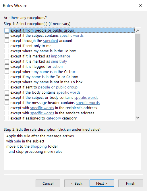 - You’ll next see a list of exceptions. You can optionally exclude certain emails from the rule. For instance, you may not want emails with attachments sent to the folder. Select Next.
