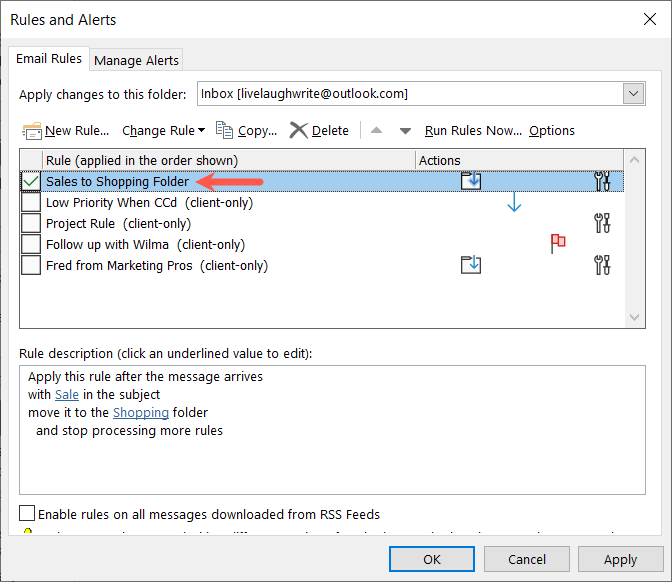 - Confirm a checkmark next to your new rule in the Rules and Alerts box and select OK.