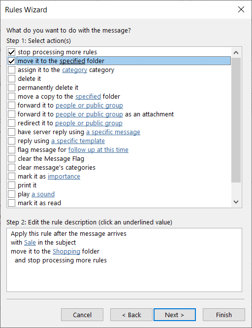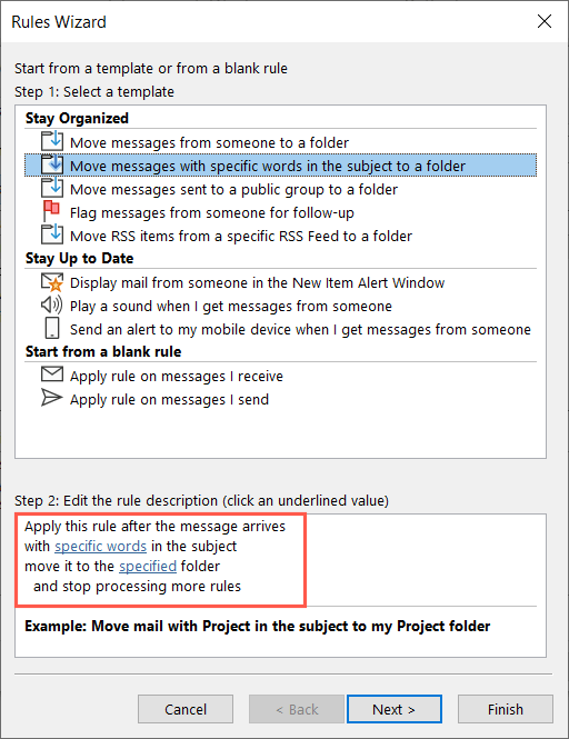 - * As an example, we’ll choose Move messages with specific words in the subject to a folder.