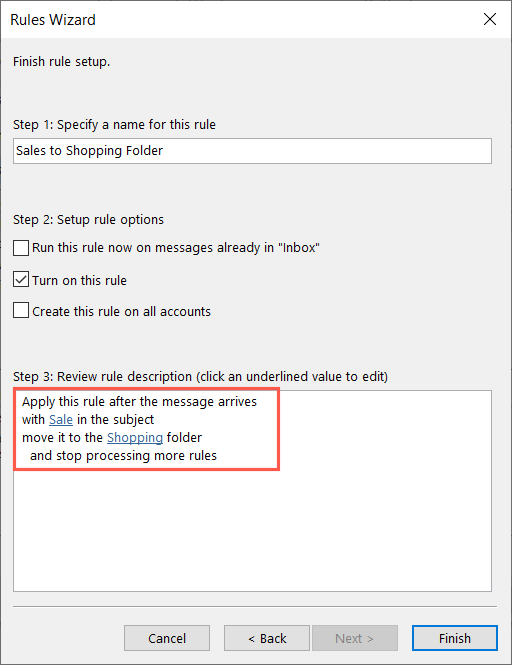 - When you finish, confirm the rule setup in the box at the bottom which shows you the condition(s) and action(s). Select Finish to save and enable the rule.