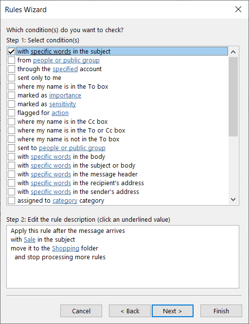 - Then, select Next. * You’ll see a list of conditions with the one you just picked automatically marked. You can choose additional criteria for the emails if you like. For instance, you may also want to apply the rule to messages sent only to you. Select Next.