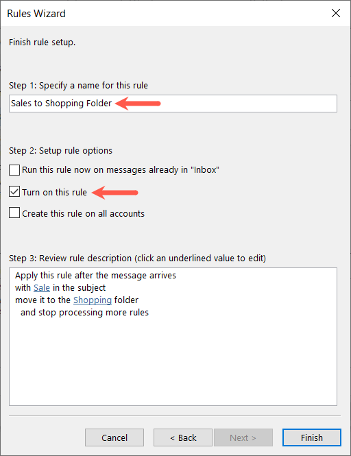- On the final screen for the rule, you’ll first give it a name at the top and then mark the checkbox for Turn on this rule. Optionally, you can check the boxes to run this rule now on your inbox or use the rule for all email accounts.