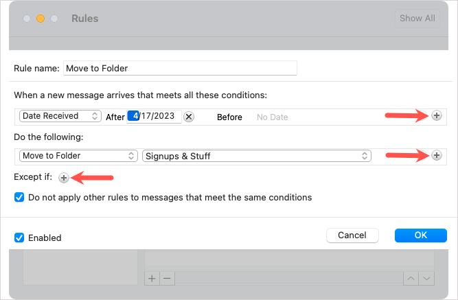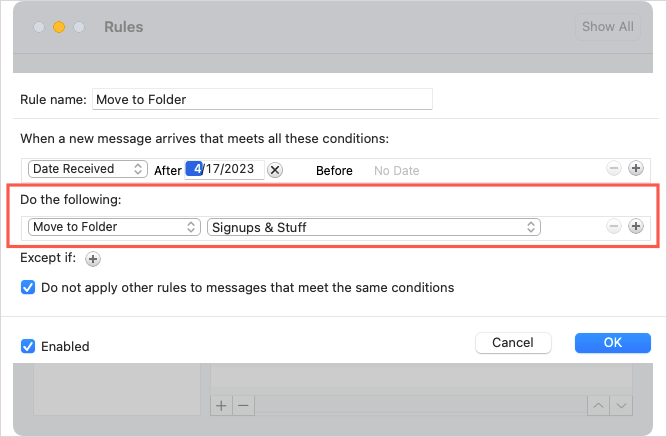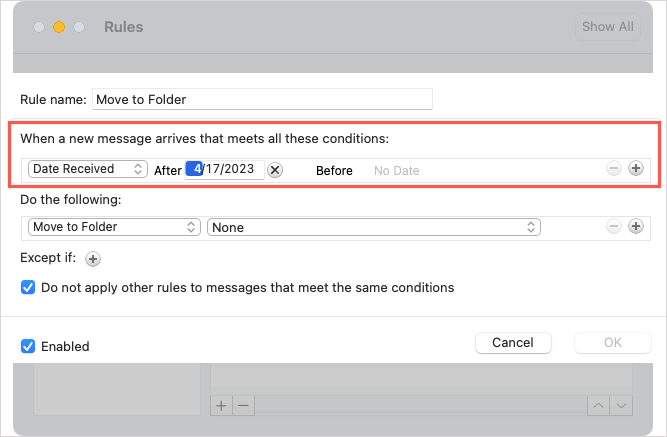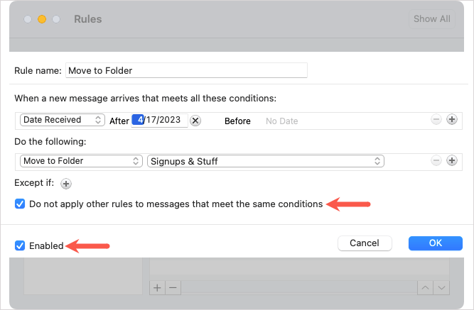 - Optionally, check the box to not apply other rules that meet the same conditions. Confirm that the Enabled box is checked on the bottom left and pick OK to save the rule.