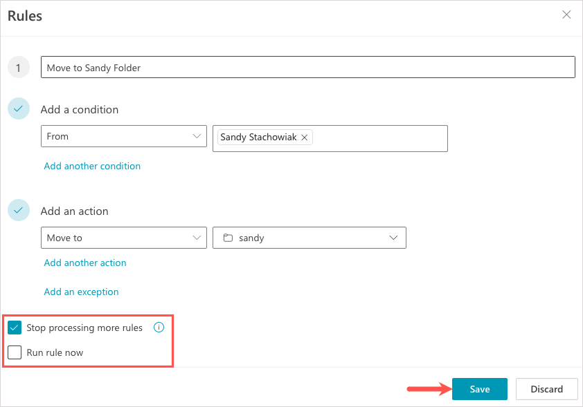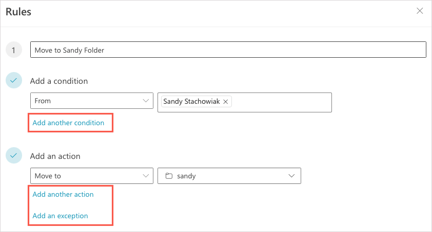 - You can use the options in blue to add another condition, another action, or include exceptions as you like.