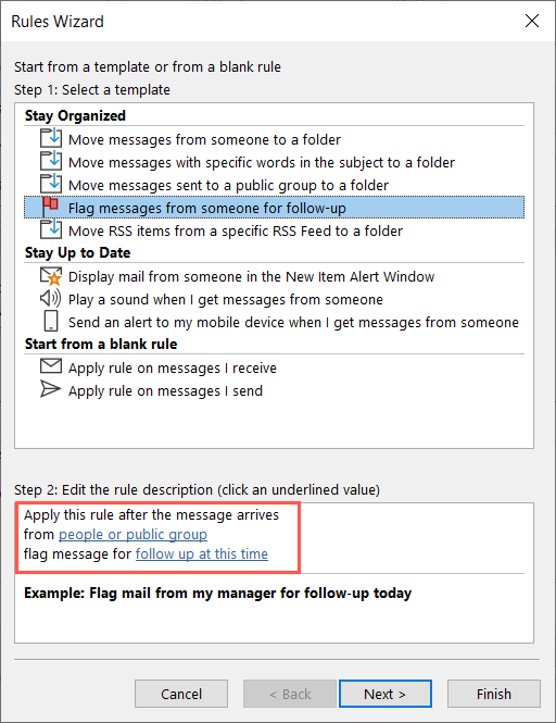 Another helpful Outlook rule is for flagging emails for follow-up. You get to choose the flag and timing for the follow-up.