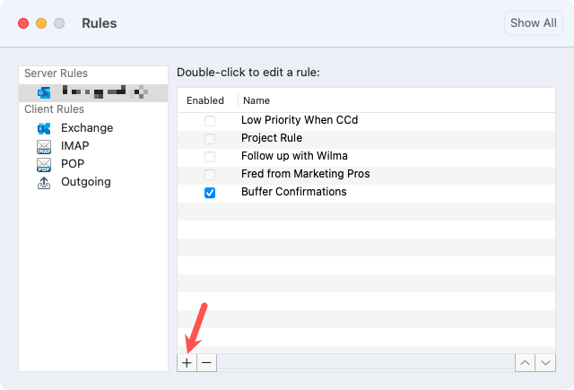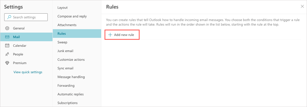 - In the pop-up window, pick Mail on the far left and Rules to the right. * At the top, select Add new rule.