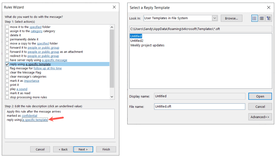 One more rule you may find helpful is an automatic reply, which is similar to an out of office message but with more flexibility. You can use a particular Outlook template or create a reply message for specific emails.