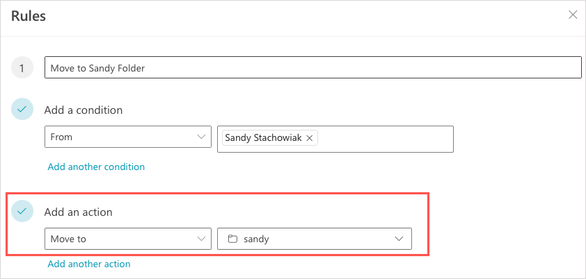 - Use the Add an action box to pick an action. Again, you may be prompted to add to the action. For instance, if you choose Move to, you’ll be asked to provide the folder name or create a new folder.