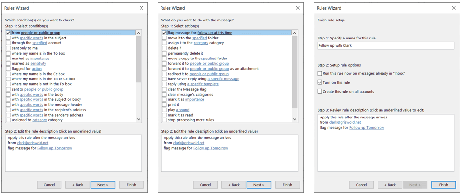 - Then, select Next. * Just like the rule above, the Rules Wizard walks you through the conditions, actions, and exceptions you can confirm and add to for your rule. Then, name, enable, and finish.