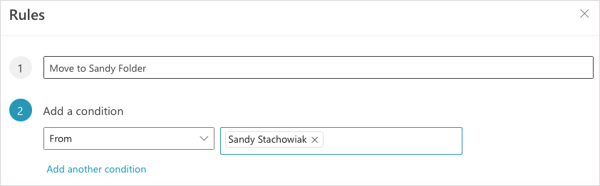 - Give your rule a name and then use the Add a condition box to pick the criterion. Depending on the condition you select, you may need to add to it. For example, if you choose From, you’ll be asked to provide the sender on the right.