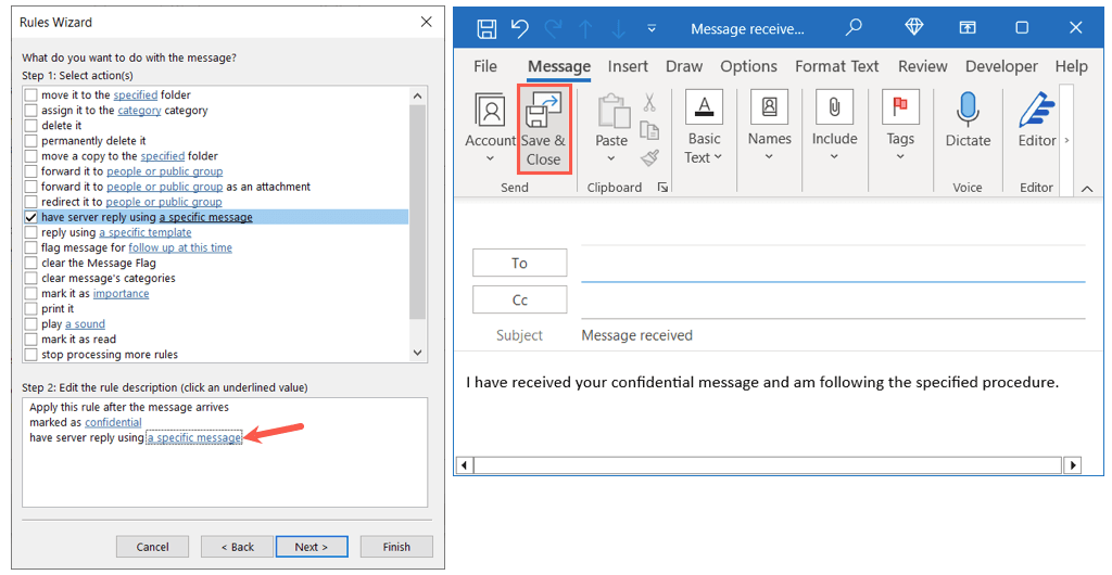 - Have server reply using a specific message: Pick a specific message, enter the message in the box that appears, and select Save & Close.