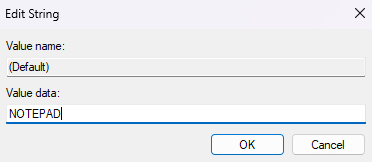 - Edit this key and replace the default value with the path of the app you want to open. For apps like the Calculator or Notepad, which are already in the system path, the app’s name is all you need. For anything else, copy/paste the path of the exe file.