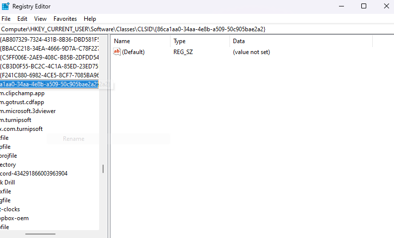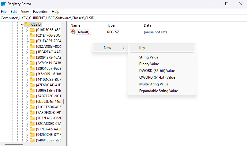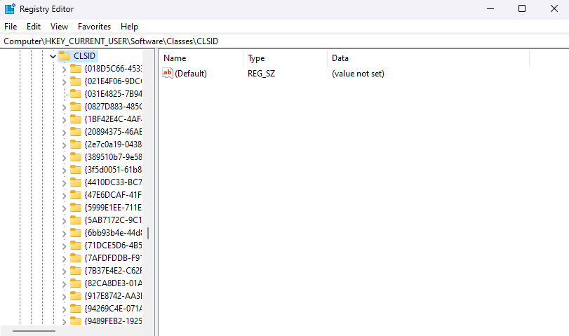 - Navigate to **ComputerHKEY_CURRENT_USERSoftwareClassesCLSID**. You can do this manually by clicking through the folders or entering this path in the address bar at the top.