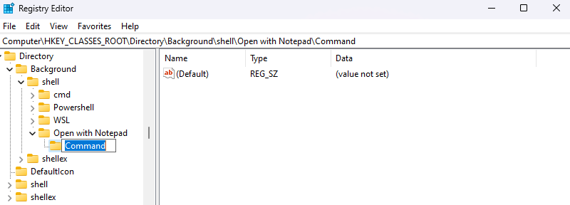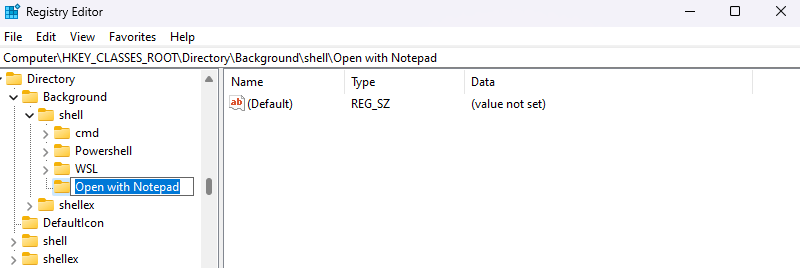 - The name of the key will become the text of the menu item, so name it appropriately. Since we are looking to add Notepad in this example, we will rename it “Open with Notepad.”