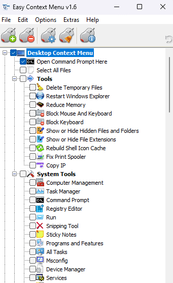 - Easy Context Menu opens a small window, displaying a list of all the tools and settings you can add to your right-click context menu. Go through the list and check the boxes you want to include.