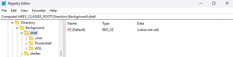 - In the left pane, navigate to the following key: **ComputerHKEY_CLASSES_ROOTDirectoryBackgroundshell ** You can also copy/paste this path directly into the address bar.