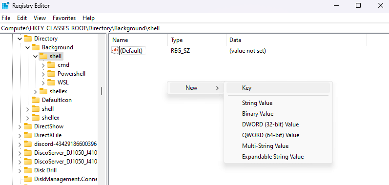 - Add a new key by right-clicking on an empty space in the right pane and selecting New > Key.