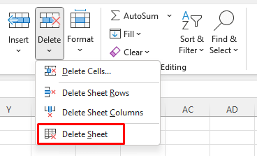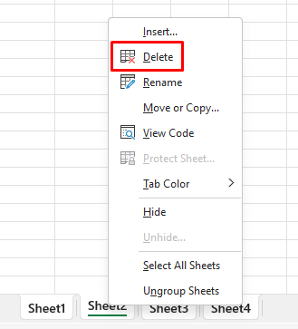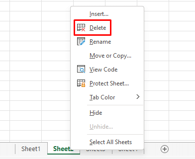 - Right-click on the sheet name and select Delete from the menu.