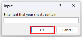 - Another dialog box will open. Here you can type the names of the worksheets you want to delete. It may be the year or a specific word that’s common. All numbers, letters, and symbols will work.