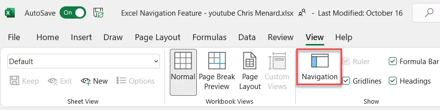 - Find the Navigation command in the Show section. The navigation pane will appear on the right side of the workbook.