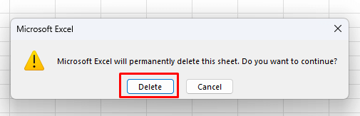 - Confirm you want to delete the sheet when prompted by selecting the Delete button.