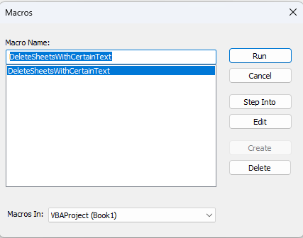 - Once you run this code, you’ll get a pop-up window. Double-click on DeleteSheetsWithCertainText to input the text.