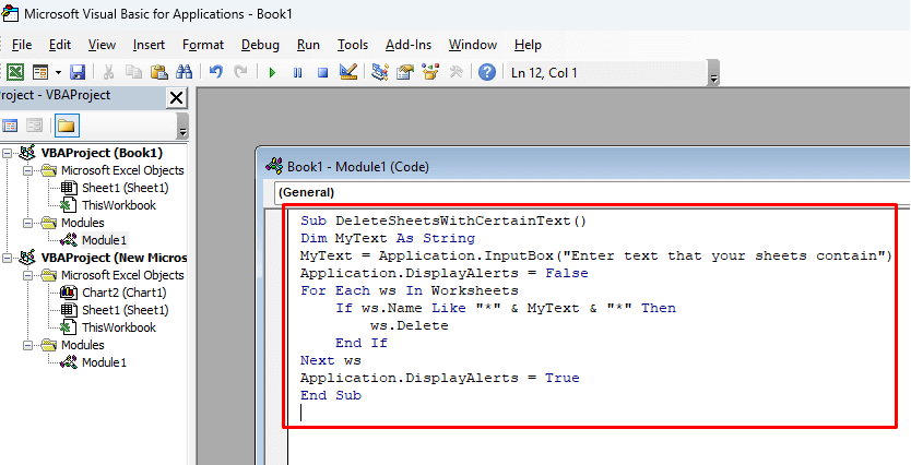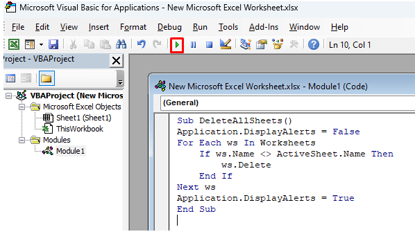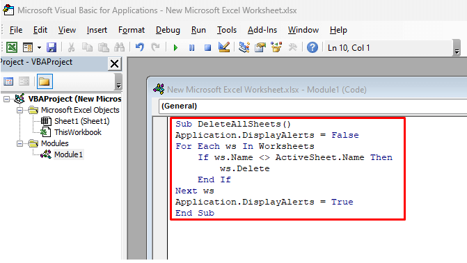7. Use the VBA Code Editor to Delete Multiple Worksheets