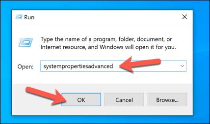- In the **Run** dialog box, type **systempropertiesadvanced**, then select **OK**. This will open the** System Properties** menu.