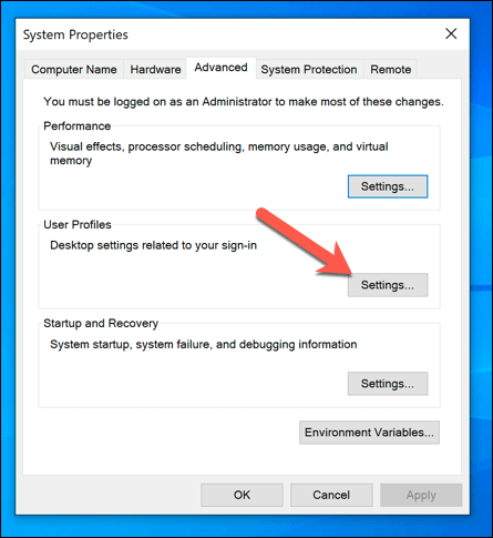 - In the **Advanced** tab of the **System Properties** menu, select the **User Profiles >****Settings** option.