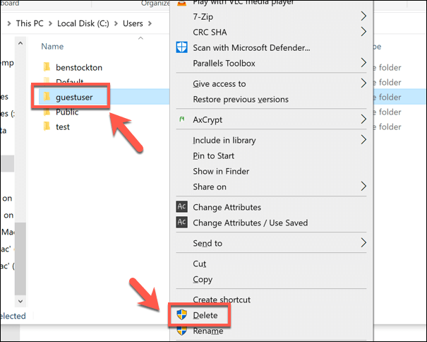 - Deleting the user account should delete the user profile, but if it doesn’t, you can remove it manually. To do this, open Windows File Explorer and use the address bar to access the **C:Users** folder. If you see a folder matching the deleted user account, right-click it and select the **Delete** option.