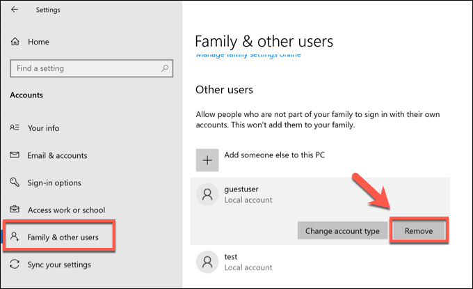 - In the Windows Settings menu, select **Accounts > Family & Other Users** to see a list of active user accounts on your PC. From there, select one of the accounts listed under the **Other Users** or **Your Family **categories, then select **Remove** to remove that user account. If the account you’re deleting is a linked **Your Family **account (such as a restricted child account), you may need to unlink it in your Microsoft Family settings online first.