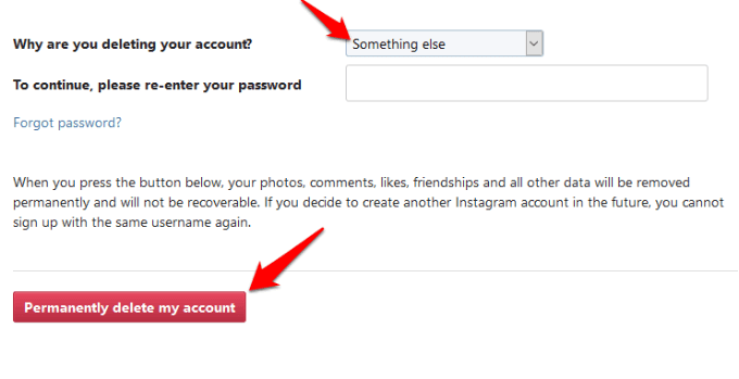 - Go to the drop down menu next to **Why are you deleting your account**, choose an option (reason), and type your password again.