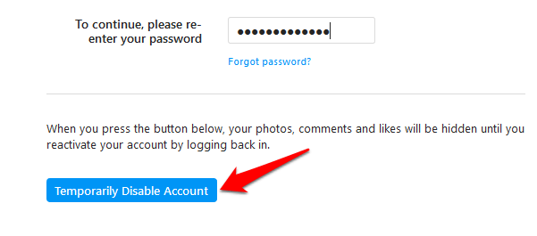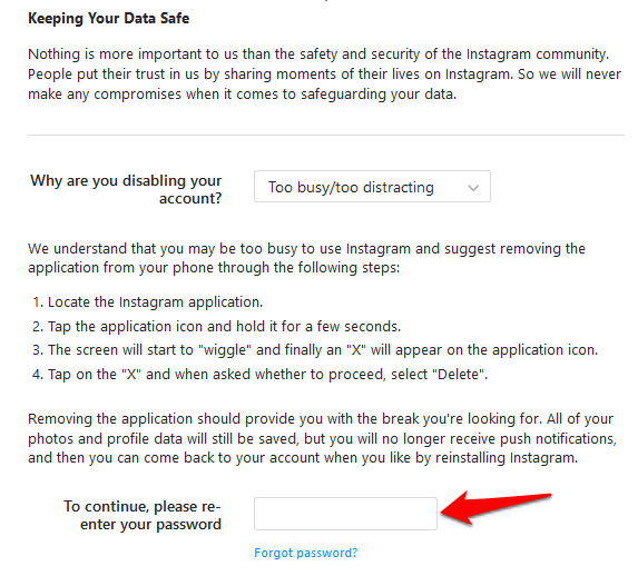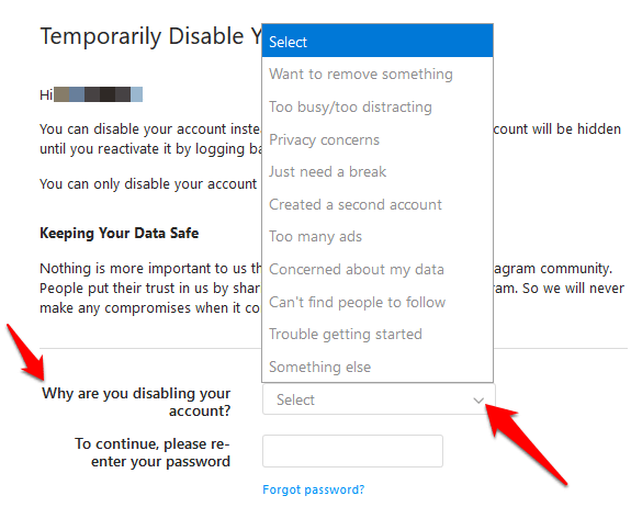 Note: You’ll only see the option to disable your account after selecting a reason from the drop-down menu and entering your password.