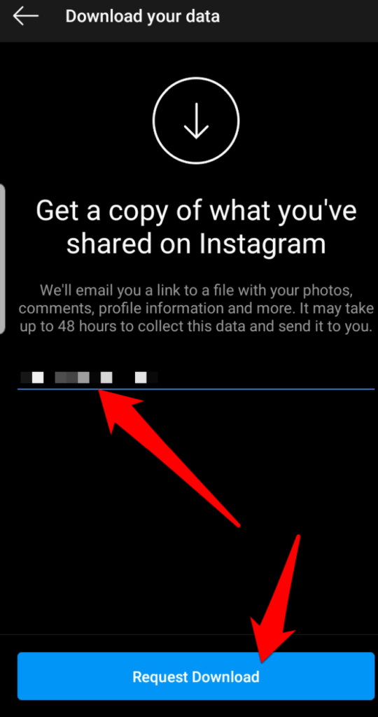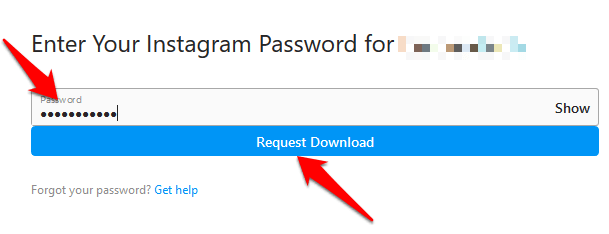 - Type your Instagram account password and click **Request Download**.