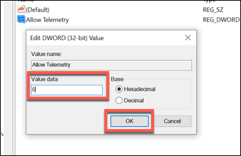 - In the **edit DWord (32-bit) Value **box, type a value in the Value data box. These match the values used by the Group Policy Editor. You can choose 0 (disabled, for Windows 10 Pro, Enterprise and Education users), 1 (basic data collection, for all users), **2 **(for enhanced collection, but no longer in use), or **3 **(full data collection). Once you’ve made your choice, click OK to save.