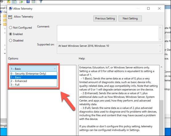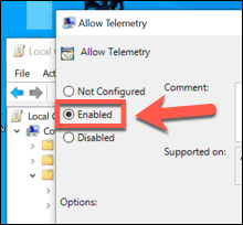 - In the **Allow Telemetry **settings window, you can change your telemetry settings. Make sure to first click the **Enabled **option in the top-left corner to allow you to configure this here.