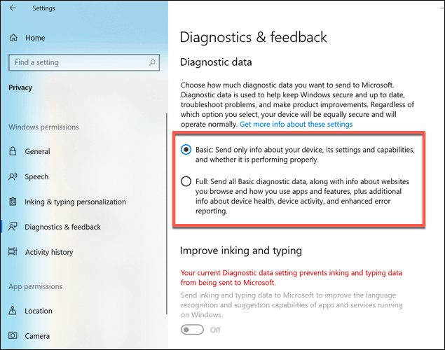 Alternatively, you could choose full data collection, which sends all diagnostic data, including data on the websites you visit, apps and features you use, device health, and additional error data for troubleshooting.