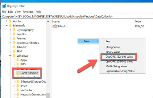 - In the Windows Registry Editor window, use the left-hand tree menu to access HKEY_LOCAL_MACHINE > SOFTWARE > Policies > Microsoft > Windows > DataCollection. In the right-hand panel, right-click and select the New > DWORD (32-bit) Value option.