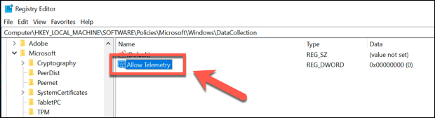 - Name the new value as Allow Telemetry. Once it’s created, double-click the value to change the value.