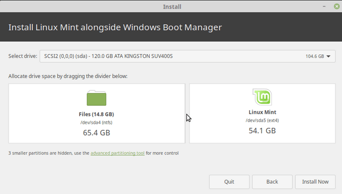 - You can drag the middle bar in either direction to determine or change the amount of space for both. Then click Install Now.