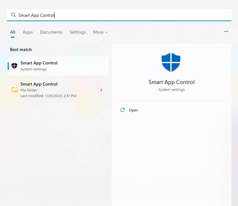 An easier option is to search for Smart App Control in the Start Menu to access the setting directly. Once it’s set to off, the other options will be grayed out unless you reset Windows.