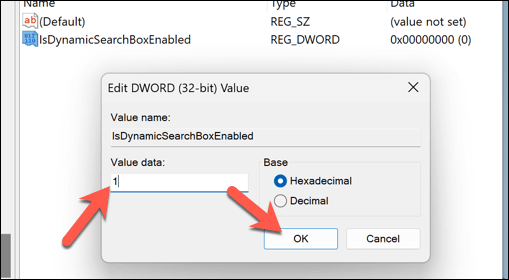 - If it isn’t, right-click and select New > DWORD (32-bit) Value, then name the new key as IsDynamicSearchBoxEnabled. * Next, double-click the IsDynamicSearchBoxEnabled key and set the value to 1 to enable search highlights before clicking OK.