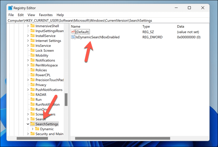 - In the Registry Editor window, use the navigation bar at the top of the tree menu on the left to navigate to HKEY_CURRENT_USER\Software\Microsoft\Windows\CurrentVersion\SearchSettings. In the panel on the right, check if IsDynamicSearchBoxEnabled is listed.