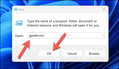 - In Run, type gpedit.msc and click OK to open the Group Policy Editor.