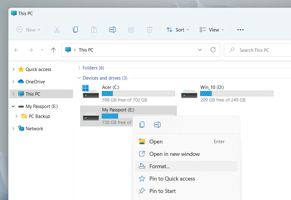 - Open File Explorer and switch to the This PC tab on the sidebar. Then, right-click the external hard disk, SSD, or flash drive you want to format and select Format on the drop-down menu.